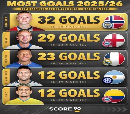 Score90统计了本赛季五大联赛球员俱乐部+国家队的进球数量,并列出榜单,哈兰德32球居首凯恩、姆巴佩二三位的。