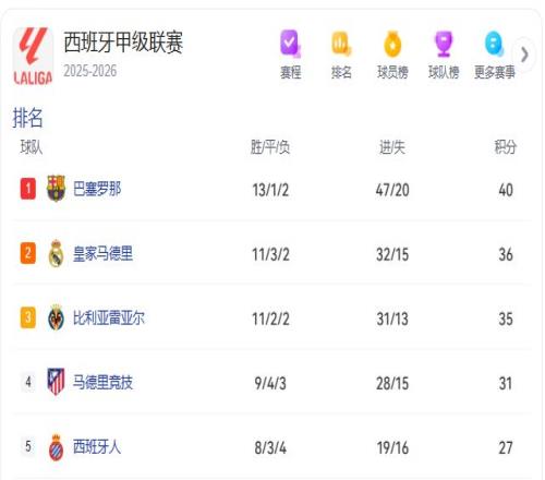 这场败仗使得他们与巴萨的分差被拉大,争冠形势骤然严峻。比利亚雷亚尔则稳扎稳打,继续在积分榜上紧追不舍。