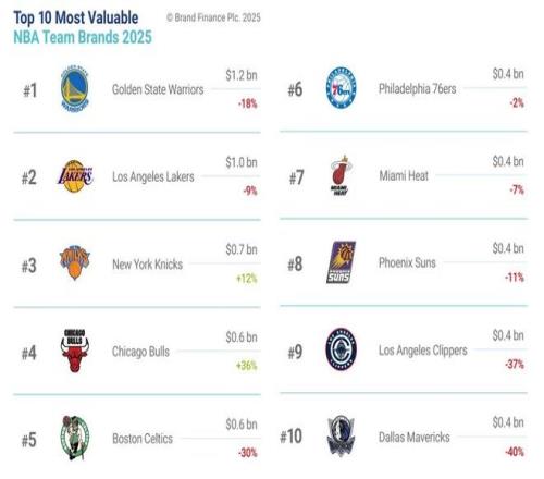英国品牌评估机构Brand Finance发布“2025美国职业篮球联赛品牌价值30强”(Top 30 most valuable NBA team brands)排行榜。金州勇士队、洛杉矶湖人队、纽约尼克斯队列前三位。