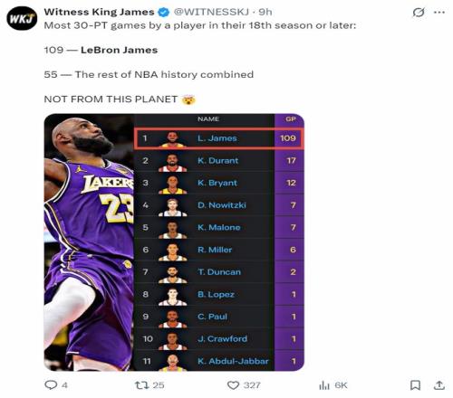 在这个联盟征战至少18个赛季的球员中,勒布朗已经拿到109次30+断崖第一,杜兰特才17次,科比只有12次,勒布朗就是历史最长的河。