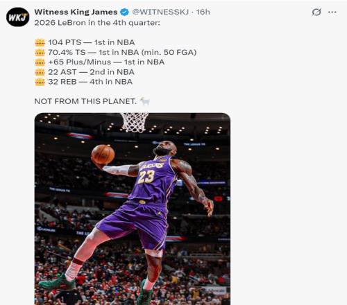 在湖人拒绝公牛逆转的赛后,美媒晒出进入2026年后,勒布朗末节104分联盟第一,杜兰特末节102分联盟第二,勒布朗41岁高龄,杜兰特37岁高龄,时光一晃眼过去了10多年,可詹杜双皇依旧炸裂。