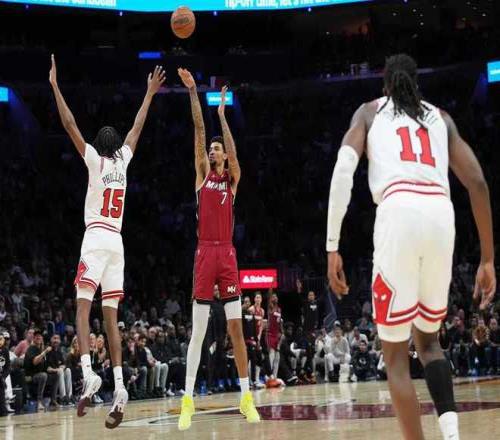 热火上一场客场116-113险胜公牛,公牛过去3场连输湖人、步行者与热火遭遇3连败,本赛季前两次交锋热火均客场战胜公牛。本场热火缺少鲍威尔、希罗、米切尔与罗齐尔,公牛缺少吉迪、怀特、武切维奇等。首节前4分半钟热火3-12落后,热火连追5分,公牛连得4分。热火持续反扑追到17-20落后,卡特三分命中,维金斯三分回敬,公牛内外开花扩大9分优势。热火再追3分,首节结束热火25-31落后公牛。首节公牛24中12,其中三分11中4,热火26中9,其中三分12中3。