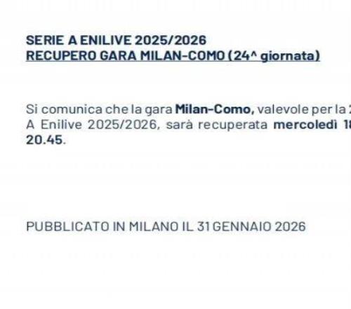 米兰圈据意甲联赛官网的消息,米兰主场与科莫的补赛时间确定,将在北京时间2月19日03:45进行。